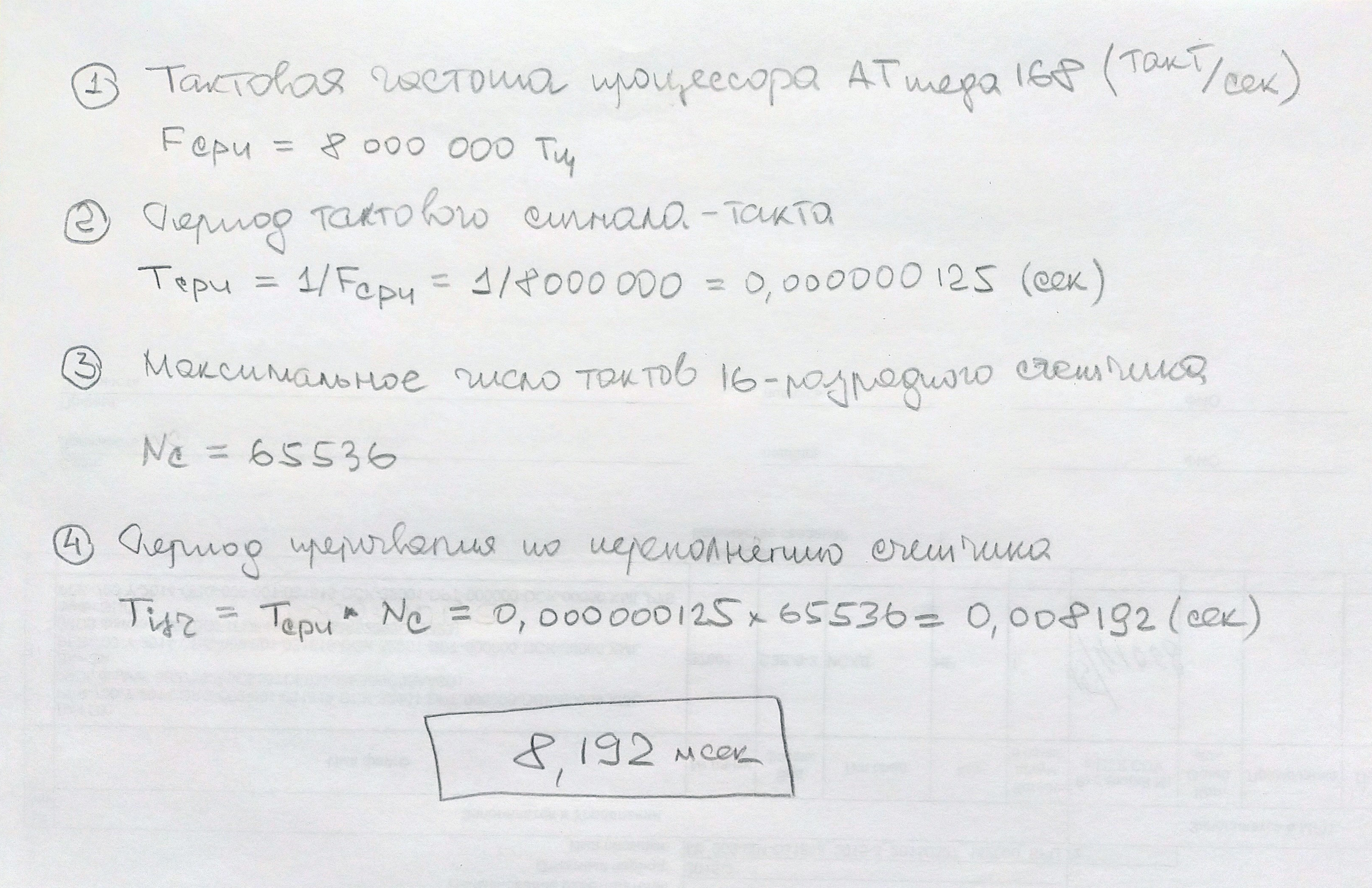 Tcpu = 1/Fcpu=1/8000000=0,000000125 сек - период тактового сигнала