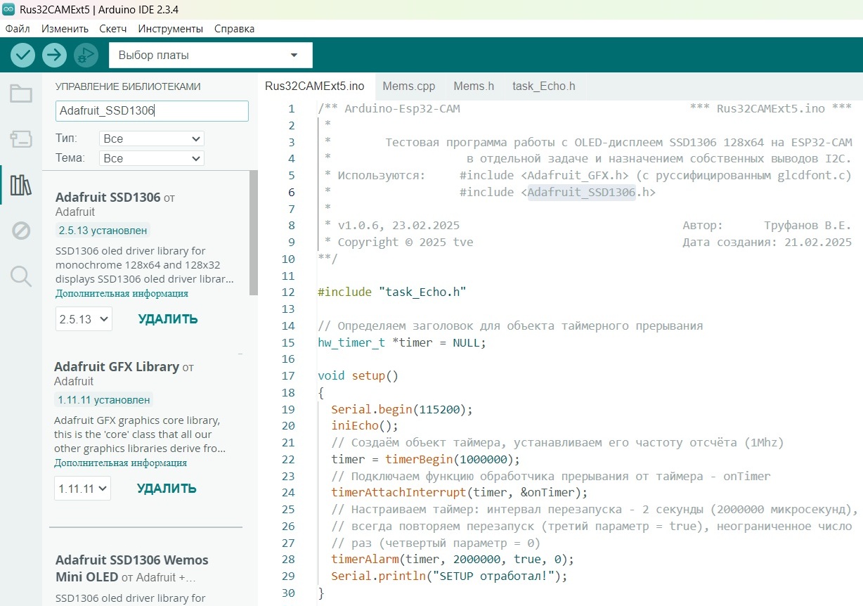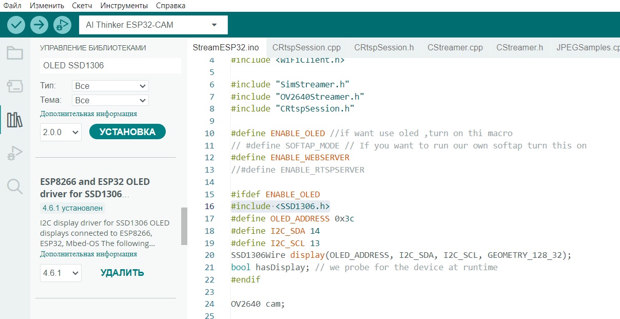 Существует несколько библиотек для работы с Oled-дисплеями. Основной пример статьи использует две библиотеки Adafruit_SSD1306.h v2.5.13 и Adafruit_GFX.h v1.11.11, установленные из IDE Arduino.