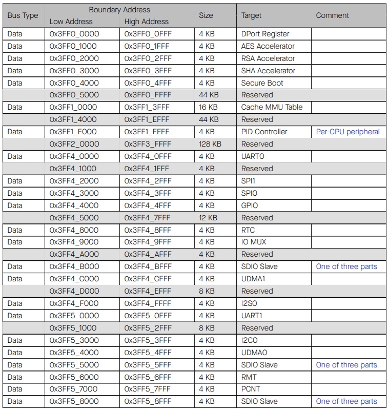 ESP32 оснащен 41 периферийным устройством. В следующих таблицах подробно описаны периферийные устройства и соответствующие им диапазоны адресов. Доступ к почти всем периферийным модулям может осуществляться любым процессором по одному и тому же адресу, за единственным исключением - это PID-контроллер.