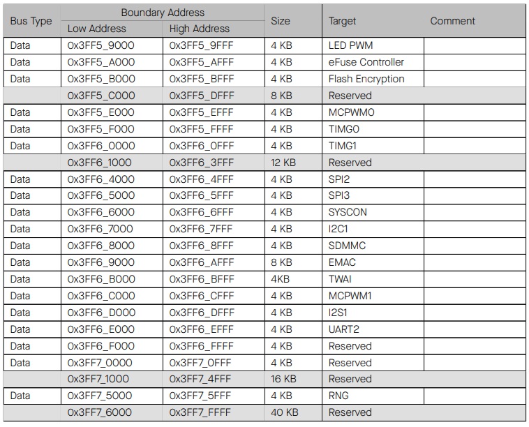 При переназначении 32-килобайтная SRAM-память больше не может быть доступна с диапазоном адресов 0x400B_0000 - 0x400B_7FFF, но она все еще может быть доступна через шину данных 0x3FFE_8000 - 0x3FFE_FFFF.