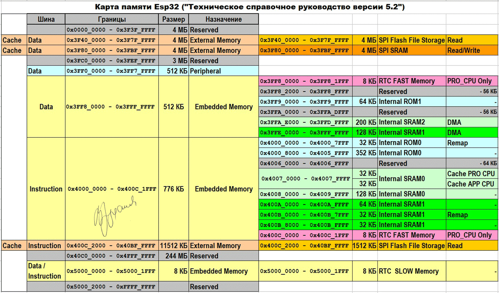 Два диапазона адресов PRO_CPU обращаются к быстрой памяти RTC в одинаковом порядке, например, адреса 0x3FF8_0000 и 0x400C_0000 используют одно и то же слово. В APP_CPU эти диапазоны адресов не предоставляют доступ к оперативной памяти RTC или к любой другой ячейке памяти.