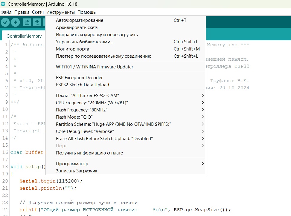 Для детального знакомства с контроллером Esp32 в меню инструментов IDE Arduino изменим настройки подменю общих параметров платы: